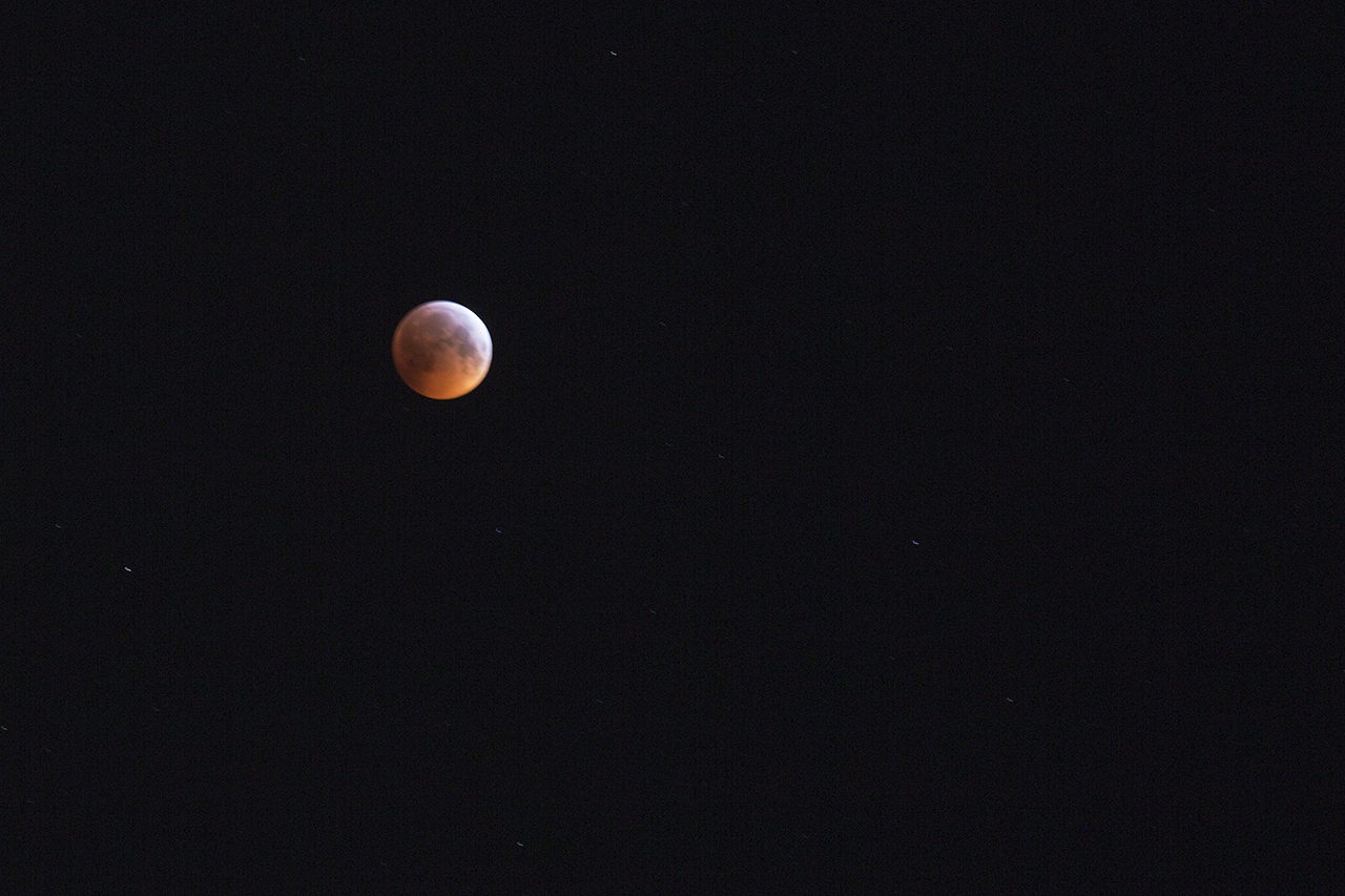Total månförmörkelse och endast rött ljus tränger igenom jordens atmosfär och träffar supermånen.