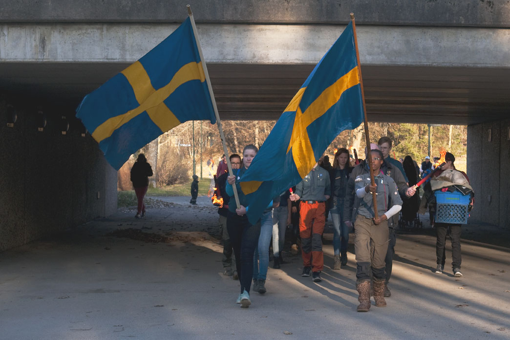 Gustaf Vasa scoutkår ledde fackeltåg från Bredängskyrkan till parkeringen ovanför Mälarhöjdsbadet för att tända Valborgsmässoelden.