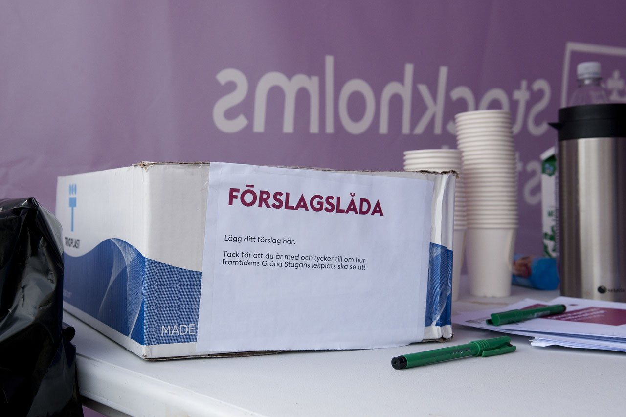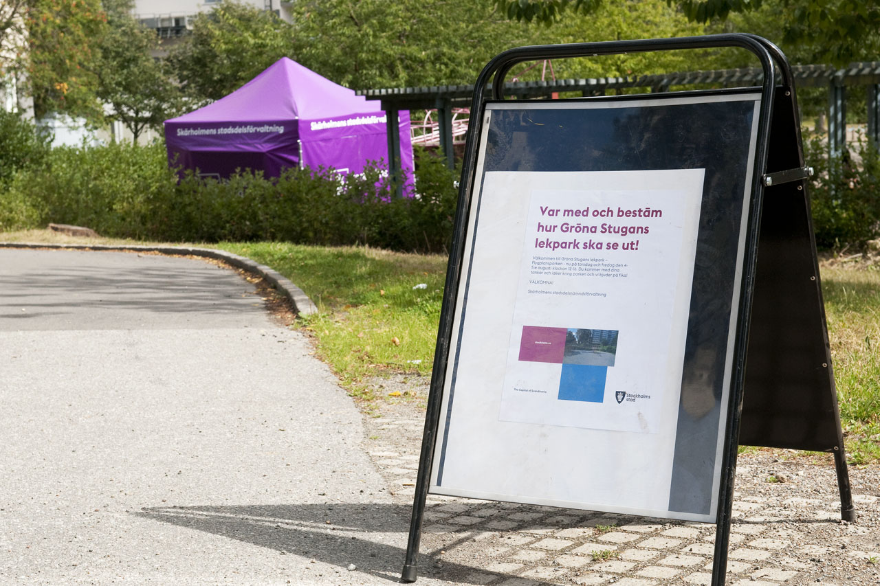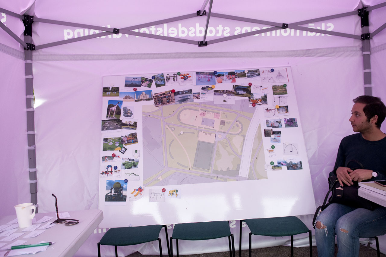 Femte augusti 2016 var en av dagarna Skärholmens stadsdelsförvaltning riggade upp ett event där allmänheten fick komma förbi och ge förslag på hur Gröna Stugans park ska se ut.