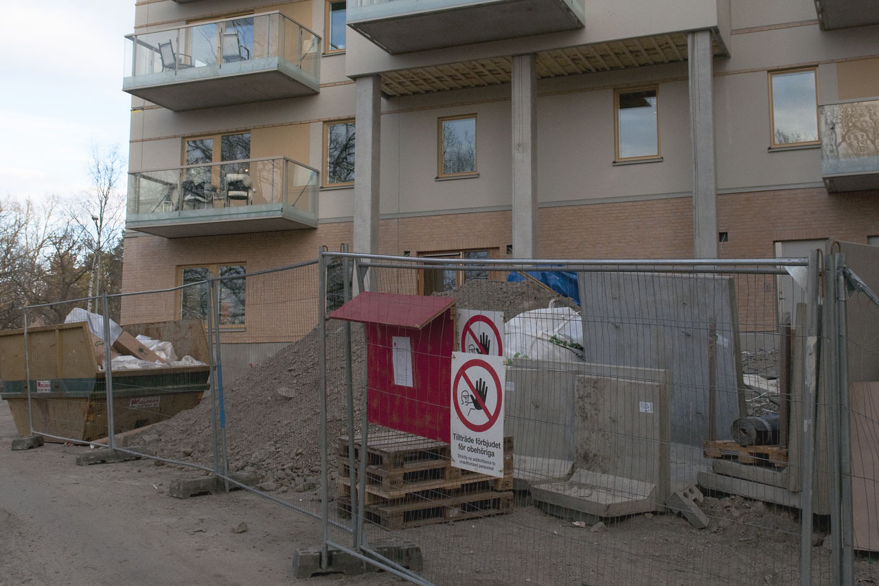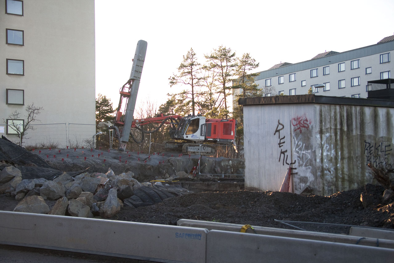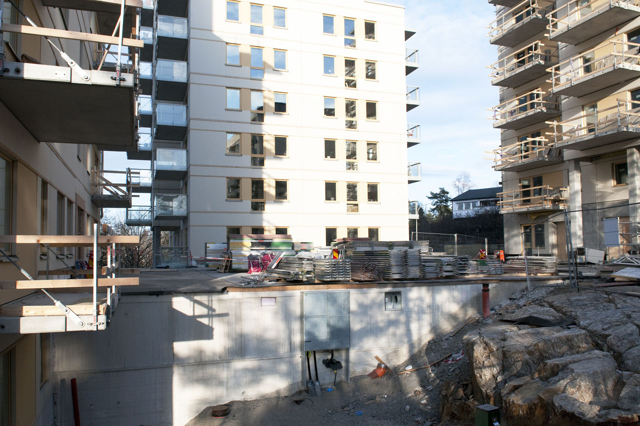 Eftersom parkeringsfrågor också måste lösas så har en riktigt fiffig bygglösning gjorts på den här platsen. Tidigare garaget med Ivars plåt som låg här har behållits. Punkthusen har byggts runt gamla garaget för att skapa en innergård mellan husen, under gården finns två våningsplan med p-platser.